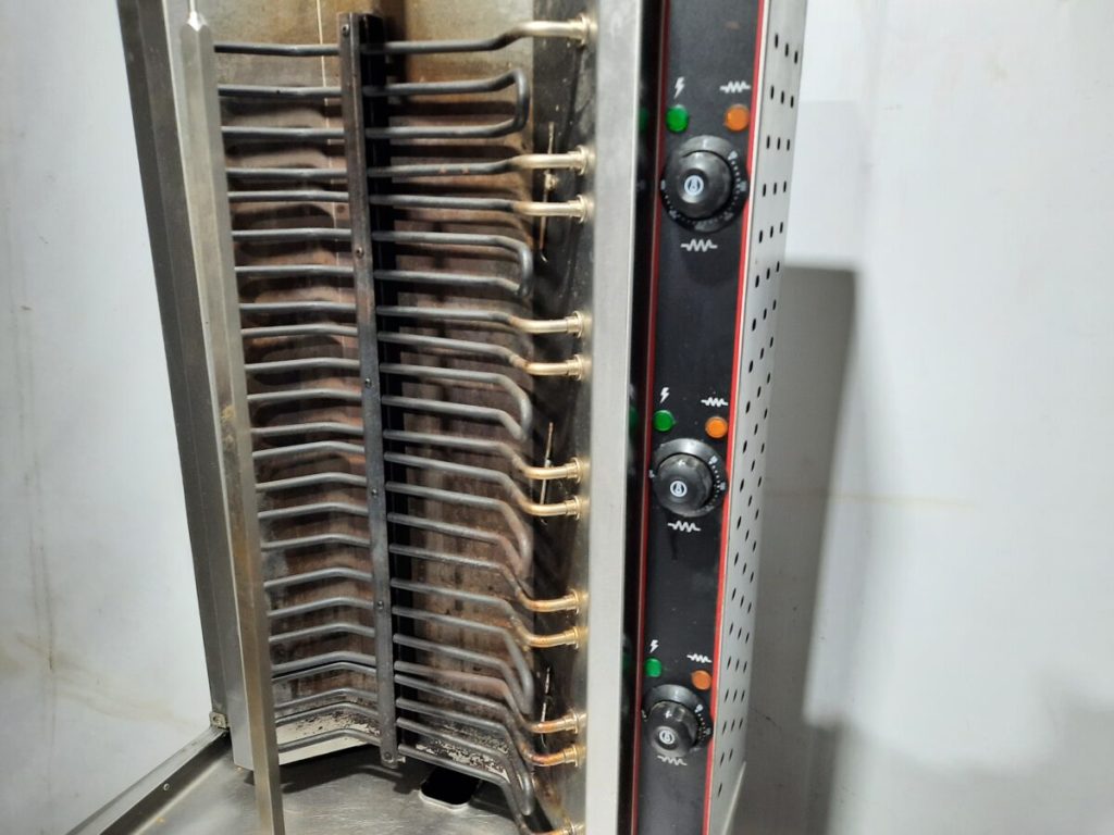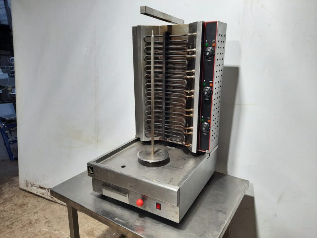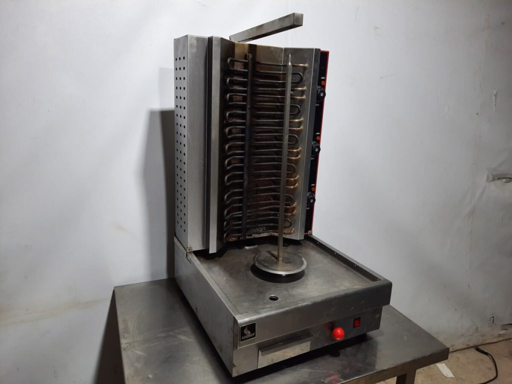 Гриль для шаурмы Airhot GRE-80 используется на предприятиях общественного питания и торговли для приготовления мясной начинки для шаурмы. Принцип действия заключается в том, что приготовленная мясная нарезка насаживается на специальный нож, который вращается вокруг своей оси около электрических ТЭНов до ее полной готовности. Модель оснащена поддоном для сбора жира. Корпус выполнен из нержавеющей стали.