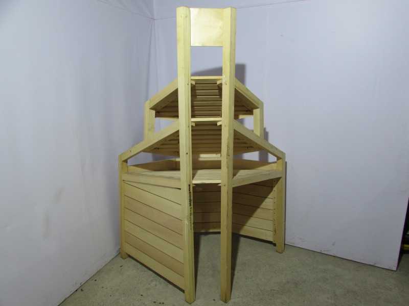 Конструкция из дерева.Можно использовать для продажи овощей,фруктов а так же хлеба.Имеет прочную и надежную конструкцию.Оборудуются деревянными корзинами разных размеров, их можно ставить на любую высоту и в разном количестве.