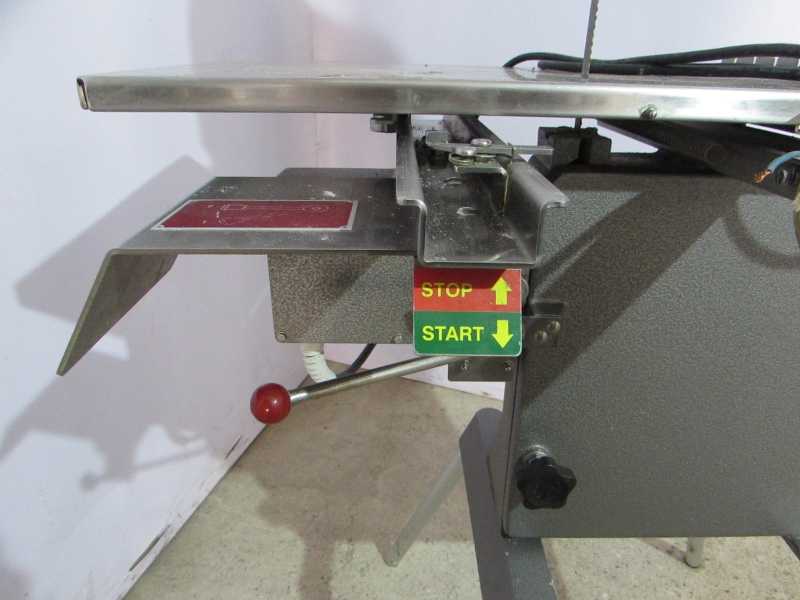 Пила для мяса Koneteollisuus Oy (KT) 325 используется на предприятиях пищевой промышленности и торговли для нарезки на куски свежего и замороженного мяса, рыбы и птицы. Модель с 1 скоростью оснащена подвижным столом и тормозным двигателем, благодаря которому режущее полотно останавливается мгновенно после отключения электропитания. Рабочее полотно, защитный кожух и кожух полотна выполнены из нержавеющей стали, корпус пилы и ножки – из алюминия.