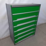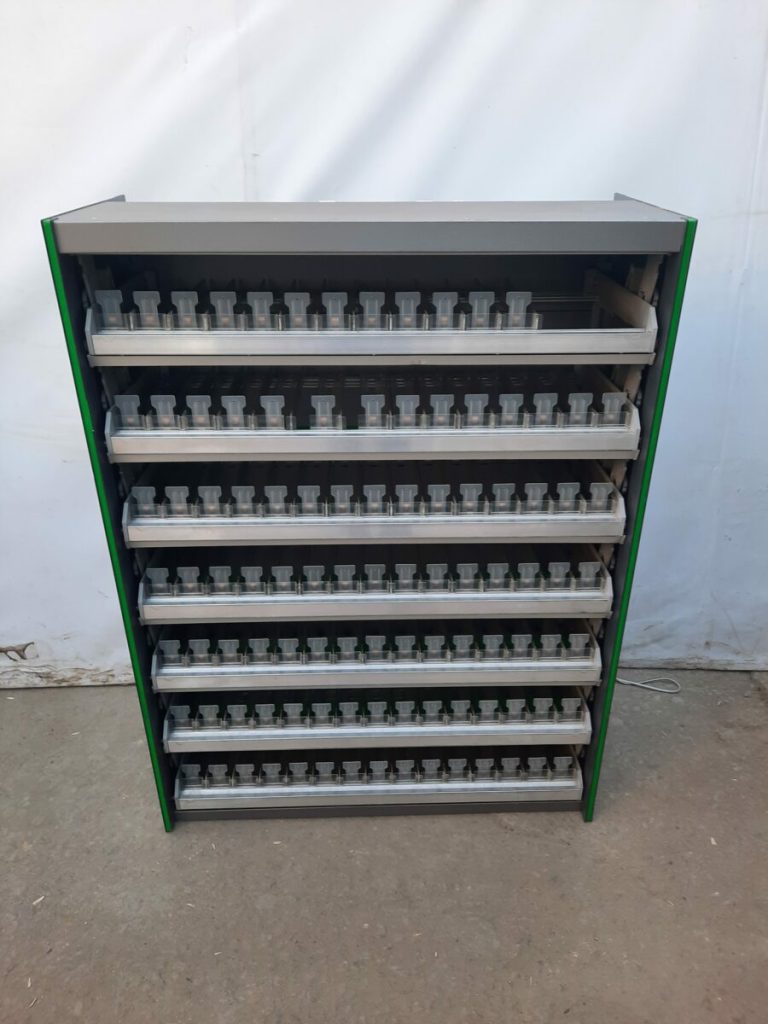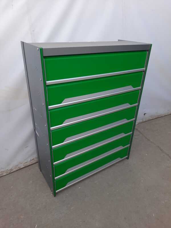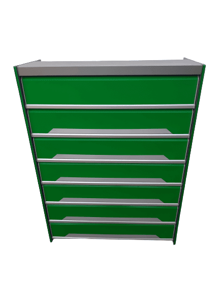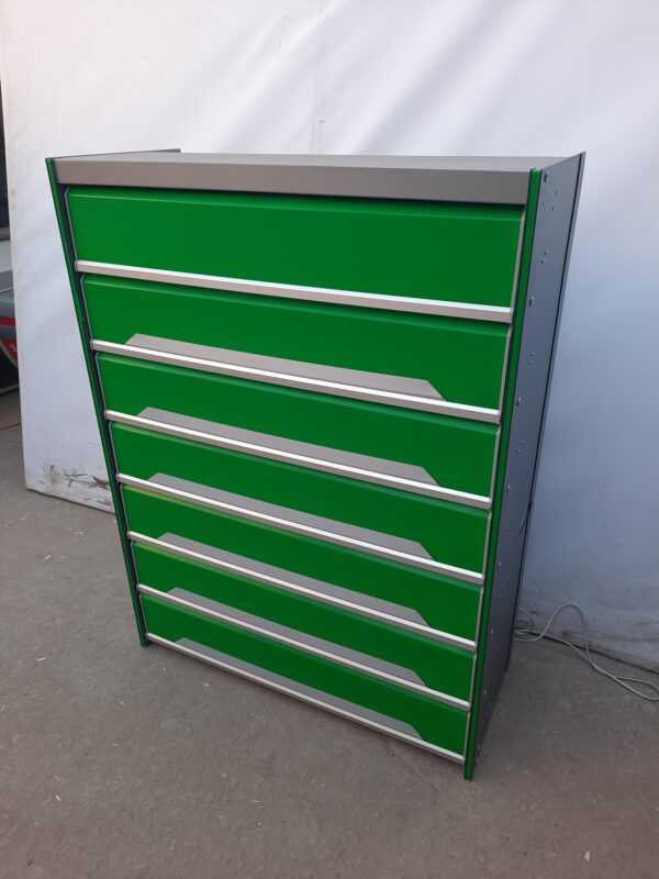 Сигареты-являясь продукцией широкого спроса, при этом достаточно широко представленной на рынке, они нуждаются в максимально презентабельной демонстрации. При этом продажа их должна осуществляться быстро и без задержек.Шкаф состоит из семи полок, которые легко открываются.Цвет зеленый.Прочная и надежная конструкция.
