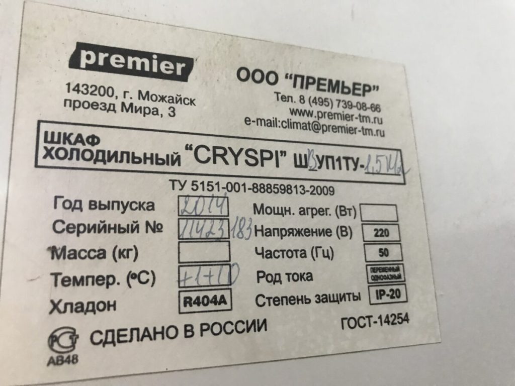 Основные характеристики: Шкаф Premier Cryspi ШВУП1ТУ-1.5М2 холодильный